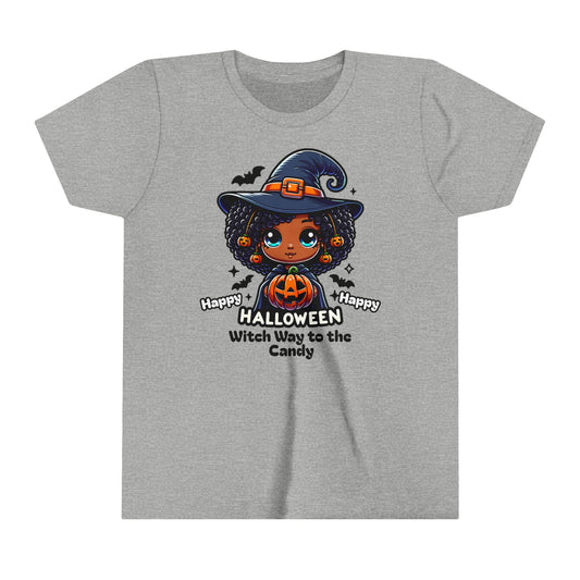 Fun Halloween T-Shirt for Kids. Witch Way to the Candy. Graphic T-Shirt of Afro Wearing Witch.